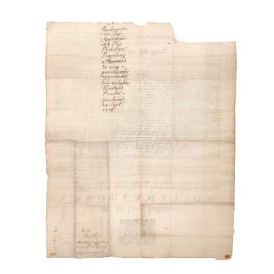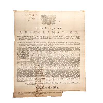 ordering the Payment of One hundred thousand Pounds to any Person who shall Seize and Secure the Pretender, in case he shall Land, or attempt to Land in any of His Majesties Dominions. London: Printed by John Baskett, Thomas Newcomb, and Henry Hills, 1714. Broadsheet, 47 x 38cm., small section excised from bottom right corner with loss of a few words of imprint, with old ink manuscript note on back 'Proclamation for Apprehending the Pretender Promising a Reward to any person who apprehends him on hundred thousand poundes, proclaimed 20 Sept. 1714' which has slightly stained the printed text on the front, [ESTC T19571 or T19572; both Rare]