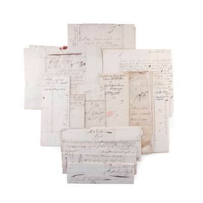 Lovat, Simon, Lord three signed notes dated between 1712 and 1723 relating to his estate, payment of bonds and business; Inglis, Hugh to Gilbert Gordon 1ff., dated London 11th April 1747, “…Poor Lord Lovat was beheaded a few hours after writing my last, He behaved like ane old true Duilnach quite undaunted even to the last, Made Several witty Speeches which seem’d quite agreeable to the Bulk of the People…”, with typed transcription pinned to upper margin; [Idem] 1ff., dated two days prior to the above, “…Poor Lord Lovat suffers this Day Several[?] of other Country Men have behaved like Villains…”; Fraser, Hector to Gilbert Gordon 1ff., dated January 1746-7, briefly mentioning Lord Lovat: “My Chief is in desperate propandy for they are resolved to have his head and Estate too…”; Macintosh, Aeneas to Moyhall dated May 1745, writing that it is not in his power to arrest Mr McKenzie, and also that he does not have enough well-equipped manpower to do so; and three others; [AND] [The Jacobite Rising of 1719] Hossack, John to ‘Gilbert’ 1ff., dated London 2nd May 1719, writing “…we had [?] notice of the miscarriage of the Spanish Fleet and for those who have landed to attempt any other than now to make their Escape will be…madness…” (12)