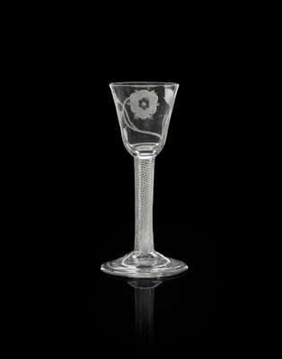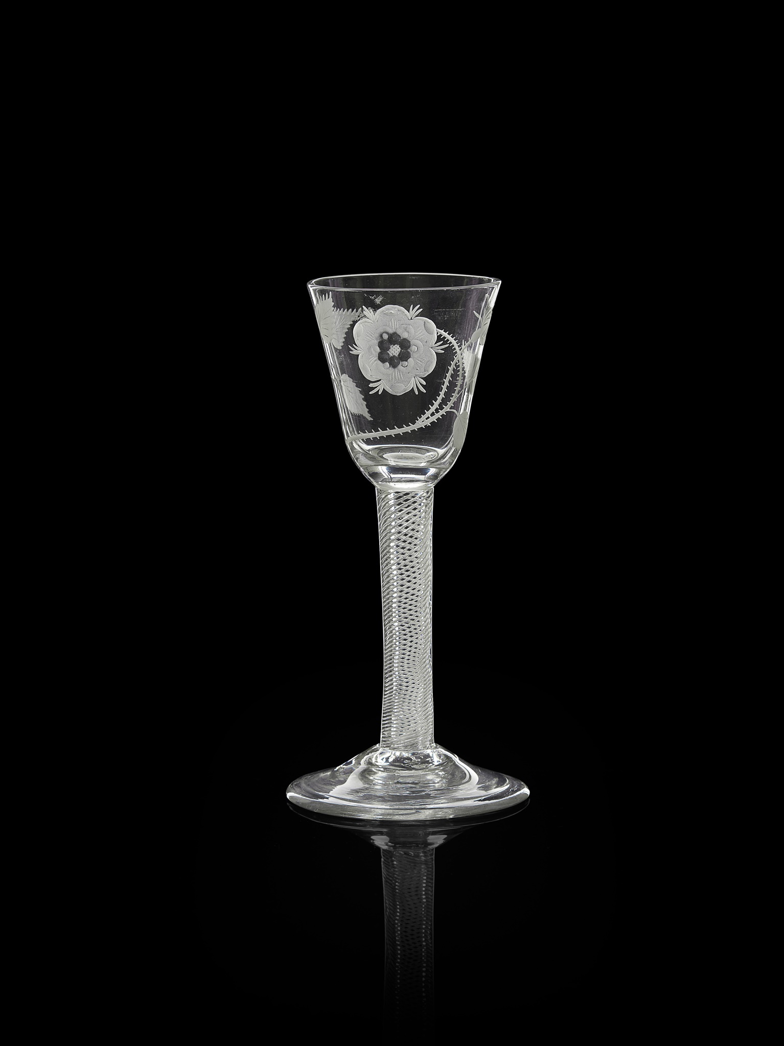 the tapered bucket bowl with finely engraved rose head flanked with bud and foliate detail, raised on a multi air twist stem and domed circular foot