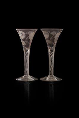 This pair are slightly larger than the recorded Chastleton Manor glasses but feature the same decoration and appear to be by the same engraver.