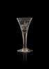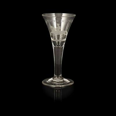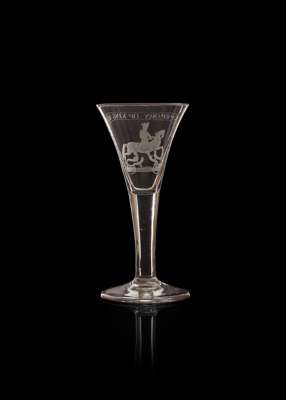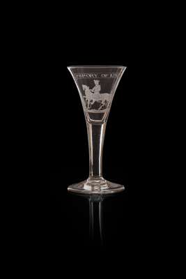 the flared bowl wheel-engraved with inscription 'THE GLORIOUS MEMORY OF KING WILLIAM THE III' enclosing a portrait of William on horseback, on a tapered plain stem and conical foot
