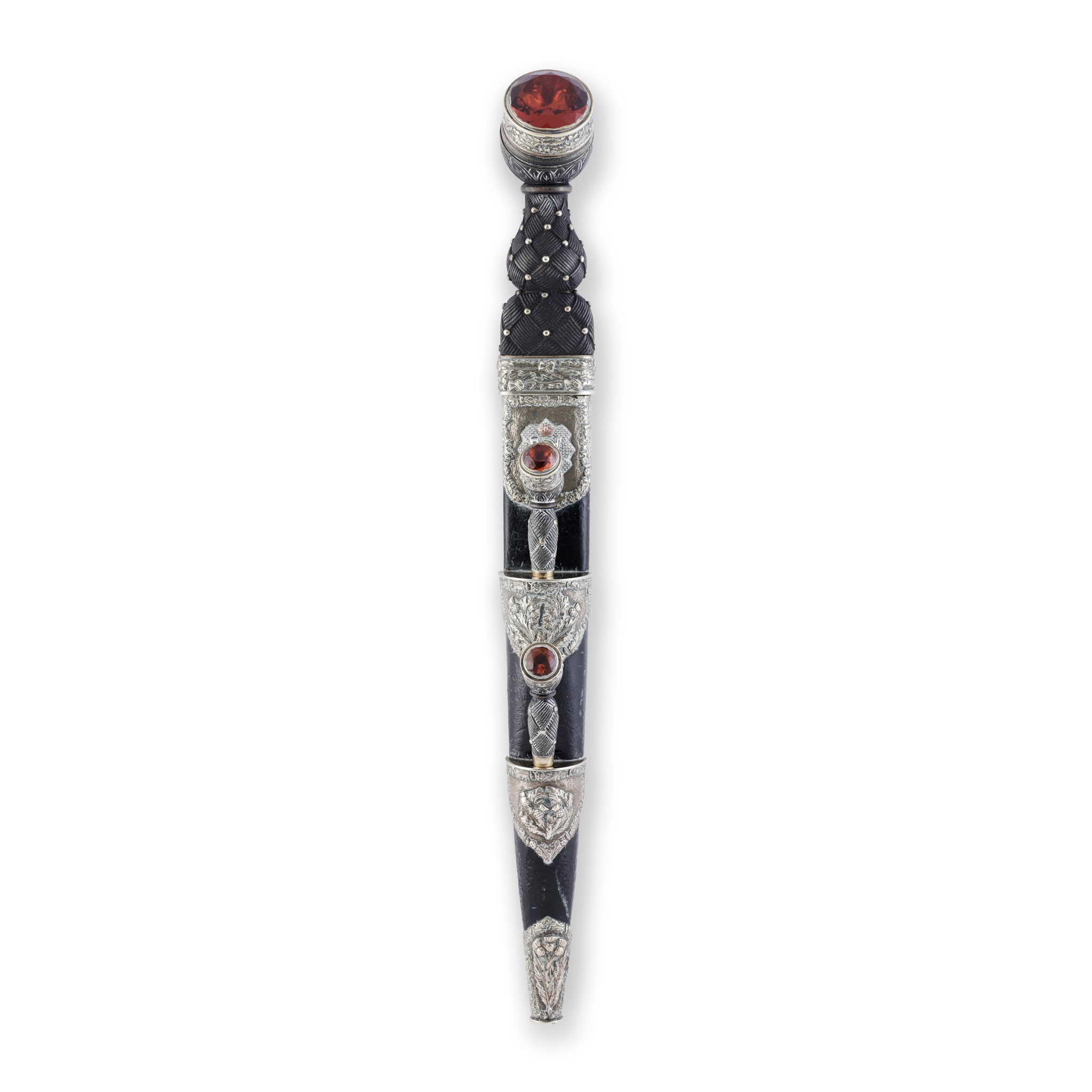 the basket weave cared handle with brass studs and collet set paste in thistle mount, the leather covered scabbard set with bi knife and fork with regimental badge and thistle decorated mount