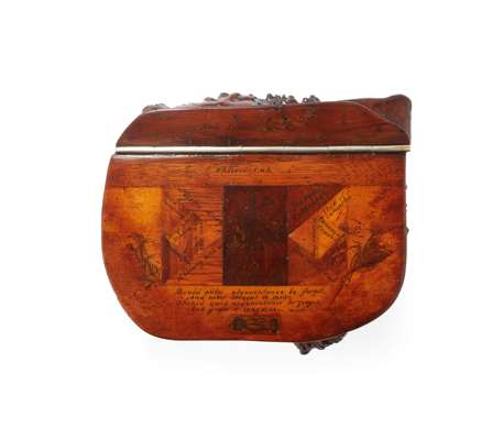 the inlaid hinged lid inscribed in pen with tobacco leaves, the joined hands of friendship and the opening lines of Auld Lang Syne, each separate wood bearing inscription of its origin