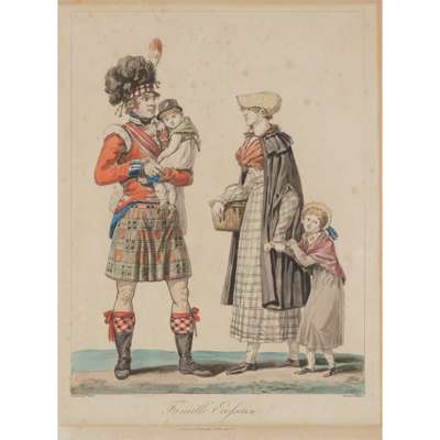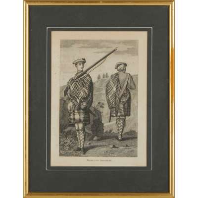 one titled 'An Officer and Serjeant of a Highland Regiment', showing two figures in full highland dress with weapons; another Highland Soldier' showing front and rear view of soldier in full dress, each in modern mounts and gilt frame; together with amounted 19th century hand coloured engraving titled ‘Famille Ecossaise’ with a Highland solider and family