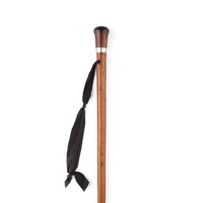 Malacca, with a brown domed wooden knop, white-metal collar and brass/iron ferrule; the cane with a tassel-hole below the collar, retaining its brass grommets and enclosing a length of black silk ribbon, knotted in three places, the collar engraved ‘MR JOHN CAIRD, MONTROSE Died 11th Decr. 1790 Aged 73’