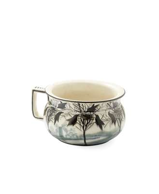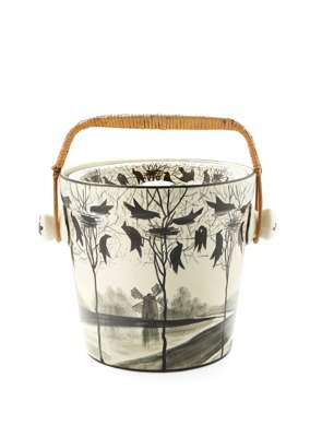 decorated with windmills, rooks and trees in a landscape, comprising a SLOP PAIL AND COVER, with wicker handle, 29cm high; a EWER AND BASIN, Ewer 26cm high, basin 39cm diameter; a CHAMBER POT, 22cm diameter; a SPONGE DISH AND LINER, 20cm diameter; a SOAP DISH, LINER AND COVER, 14cm diameter; and a BEAKER VASE, apparently unmarked, 11.5cm high, all others painted EARLSHALL
