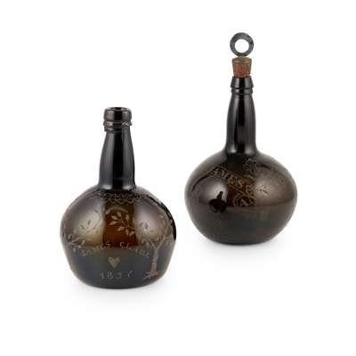 TWO CHIP ENGRAVED GREEN GLASS BOTTLES