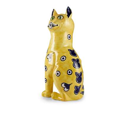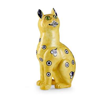 covered in a yellow glaze with painted blue on white decoration, with applied green glass eyes, faintly impressed WEMYSS, retailer's stamp T. GOODE & CO.