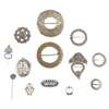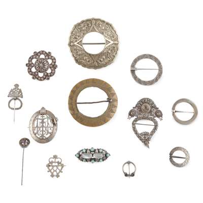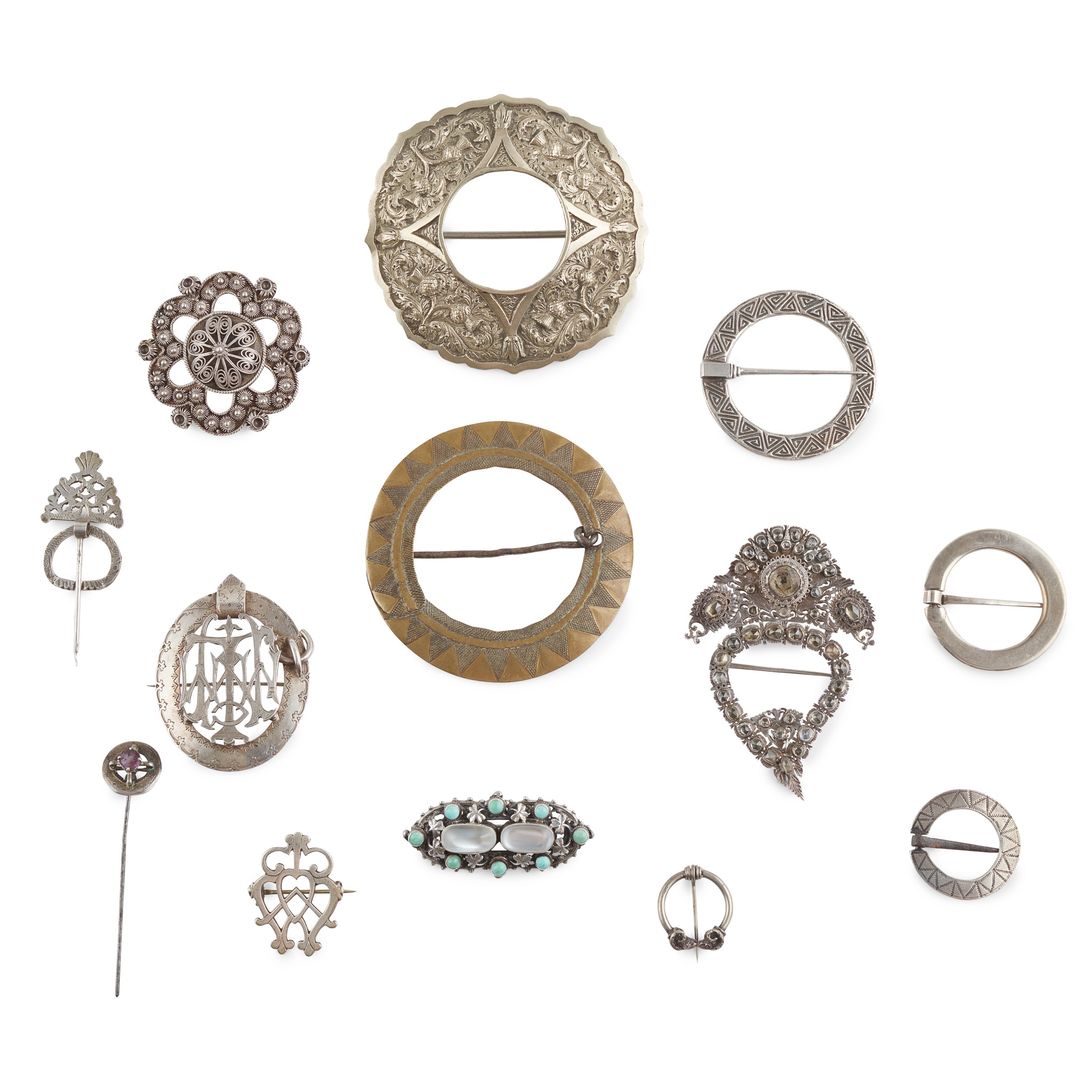 to include, an engraved Victorian monogrammed initial badge, a brass ring brooch in an early 18th century style, a silver-plated embossed thistle plaid brooch and various other luckenbooth and ring brooches