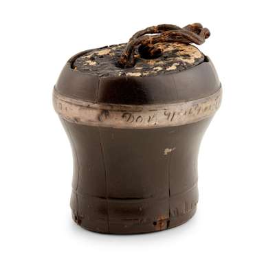 the lignum vitae body of traditional baluster form with applied silver band around shoulder, the band engraved with motto and dated 1728, with cork bung with leather lace pull