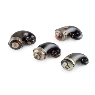 of traditional form, the domed hinged lid, centrally set with an agate cabochon, in an engraved presentation border, ''To James Dennistoun... from his friend Colin Campbell'; together with three further curly horn snuff mulls, one with a mixed-cut citrine set to the domed hinged lid, with applied shield to body; one engraved 'John McLennan, Tain' to neck and intials to hinged lid and another with applied foliate detail and engraved initials to the hinged lid