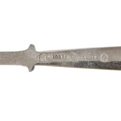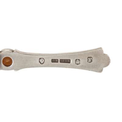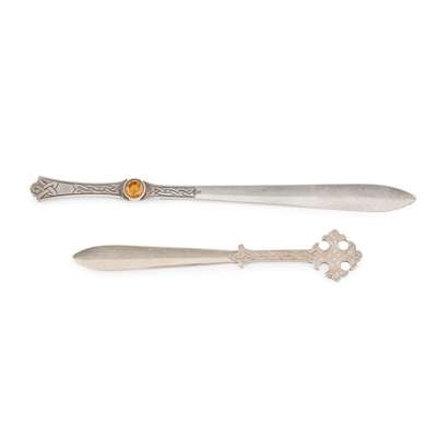 the smaller formed as an engraved Celtic cross with a short shaped blade, marked ROBB, BLTR (incuse), Edinburgh 1906; together with a larger example with centric knot work engraved handle collet set with a cairngorm and with long tapered blade and paper clip to reverse, marked ROBB, BLTR, Edinburgh 1911