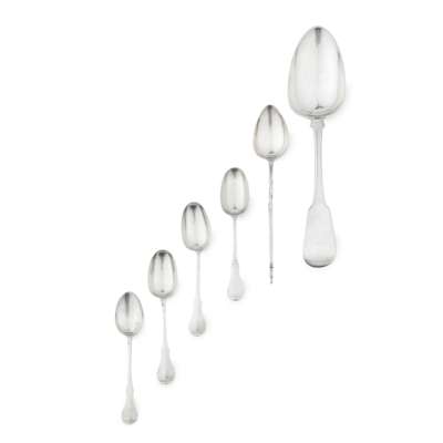 marked IK, urn, F, with twisted stem; together with three Scots Fiddle pattern teaspoons for Canongate, marked WC and another similar marked D&H and a tablespoon, Hinchcliffe, Glasgow 1824, of Fiddle pattern