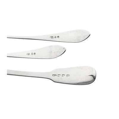 a pair by Edward Livingstone marked EL, stalks, crowned heart of Celtic Point pattern and a Fiddle Pattern example by William Leighton marked WL, pot of lilies thrice, each with engraved script initials