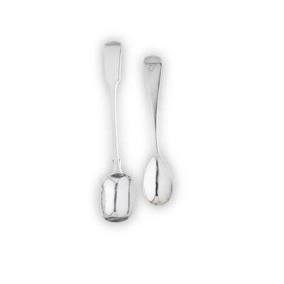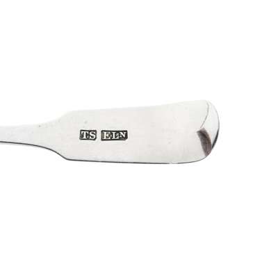 marked TS, ELn, of Fiddle pattern with vacant terminal and square scooped bowl; together with a mustard spoon by the same maker of Old English pattern with foliate initial F to terminal