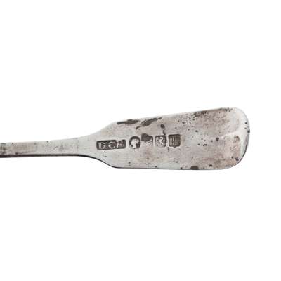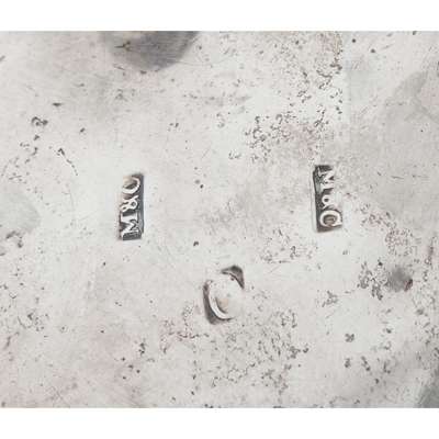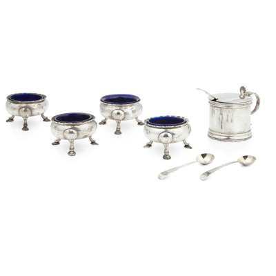 each with scalloped rim, raised on three shell clasped legs with hoof feet; together with a mustard, Hamilton & Inches, Edinburgh 1921, with shell clasped thumbpiece; with three unassociated condiment spoons