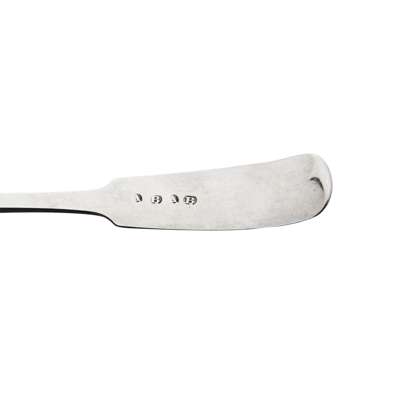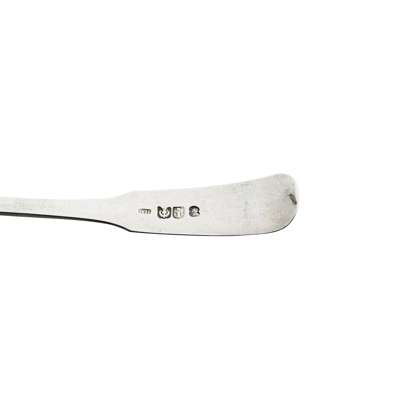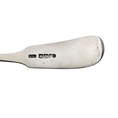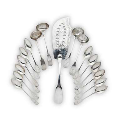 marked JS, device struck six times, of Fiddle pattern with vacant terminal, the shaped ladle with pierced and engraved fish and foliate borders; together with a set of twelve teaspoons, Fiddle pattern W Hannay (of Paisley) Edinburgh 1814; two Fiddle pattern toddy ladles A Cameron (of Dundee), Edinburgh 1820, a toddy ladle possibly Aberdeen marked A, B, A, B and an Edinburgh toddy ladle
