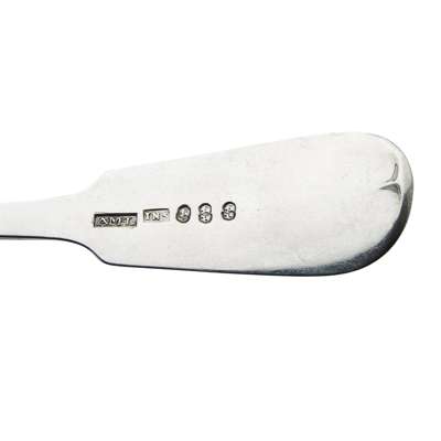 marked AML, INS, double device struck three times, of Fiddle pattern the terminal with engraved script initials AJMcE, the shaped blade with pierced section and engraved urn of flowers and scrolling foliage