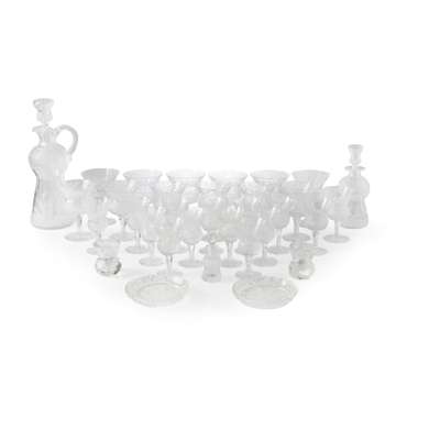 comprising twelve wine glasses, eleven smaller port glasses, one slightly larger claret glass, a decanter jug with stopper, a small decanter with stopper, a small scent bottle, two small posy vases, and two round butter dishes