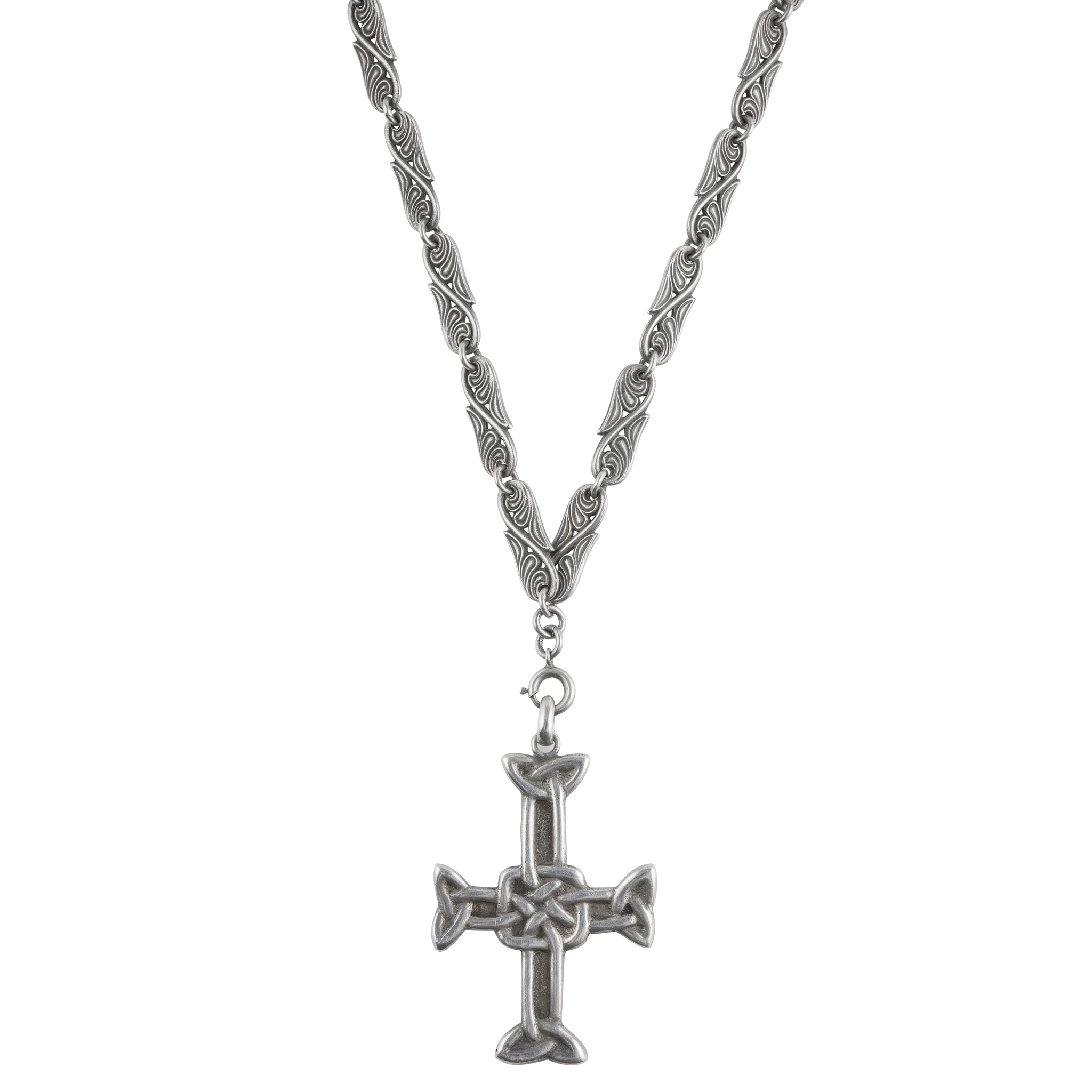 marked AR IONA, Glasgow 1921, the Celtic cross of interlaced form, suspended from a long ivy link chain