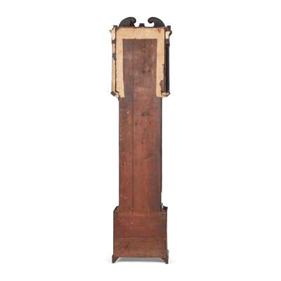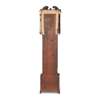 the hood with a swan neck pediment above an arched painted dial with moonphase action, subsidiary seconds and calendar dials and twin winding holes, flanked by spiral carved corner columns, above a shaped trunk door and spiral carved quarter columns, on a moulded plinth with ogee bracket feet, the twin-train, eight-day movement striking a bell