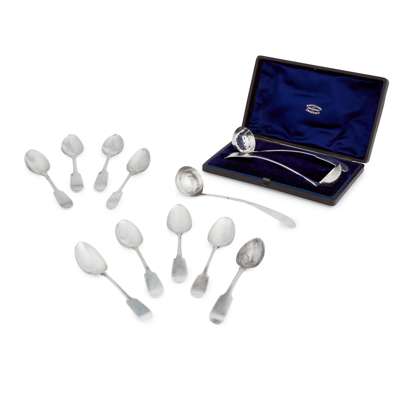 to include, three by William Ferguson, of Elgin, with Edinburgh hallmarks, 1841, of Fiddle pattern; three by George Booth of Aberdeen, of Fiddle pattern, initials engraved to terminal and three Aberdeen, various makers, of Fiddle pattern; together with a cased pair of sugar sifters, Rettie & Son, ABD, Edinburgh 1847 of Fiddle pattern and another John Keith., Banff, marked IK, B, of Celtic Point pattern with engraved initials to terminal