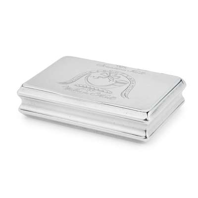 marked DS, S&S, DS, of rectangular outline, with a presentation engraving and inscription to hinged lid, 'FROM Jonathan Halle/ TO/ William Halle, with crest and motto