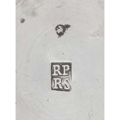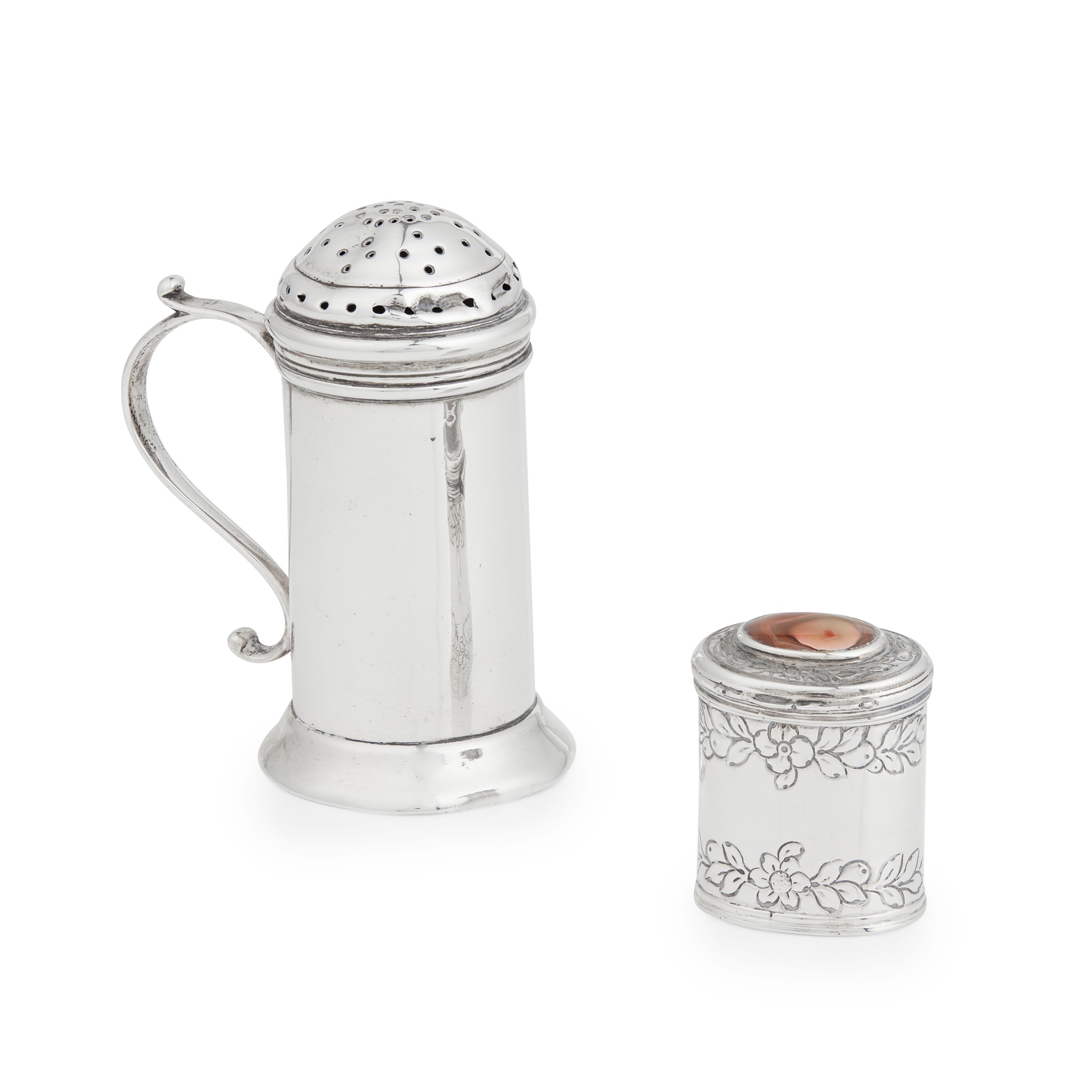 marked RP/RS, of cylindrical form, S-scroll handle, to a spreading circular foot, the pull-off domed lid with pierced detail; together with an agate set snuff box, unmarked, chased floral borders to body, the hinged lid inset with an oval agate