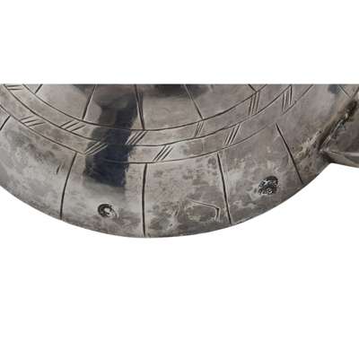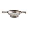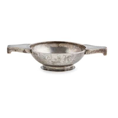 of traditional form, engraved to the body as a staved quaich with engraved MC initials, the lugs with an engraved stylised border, to a circular foot