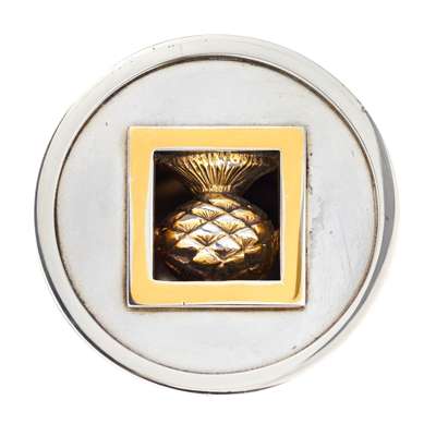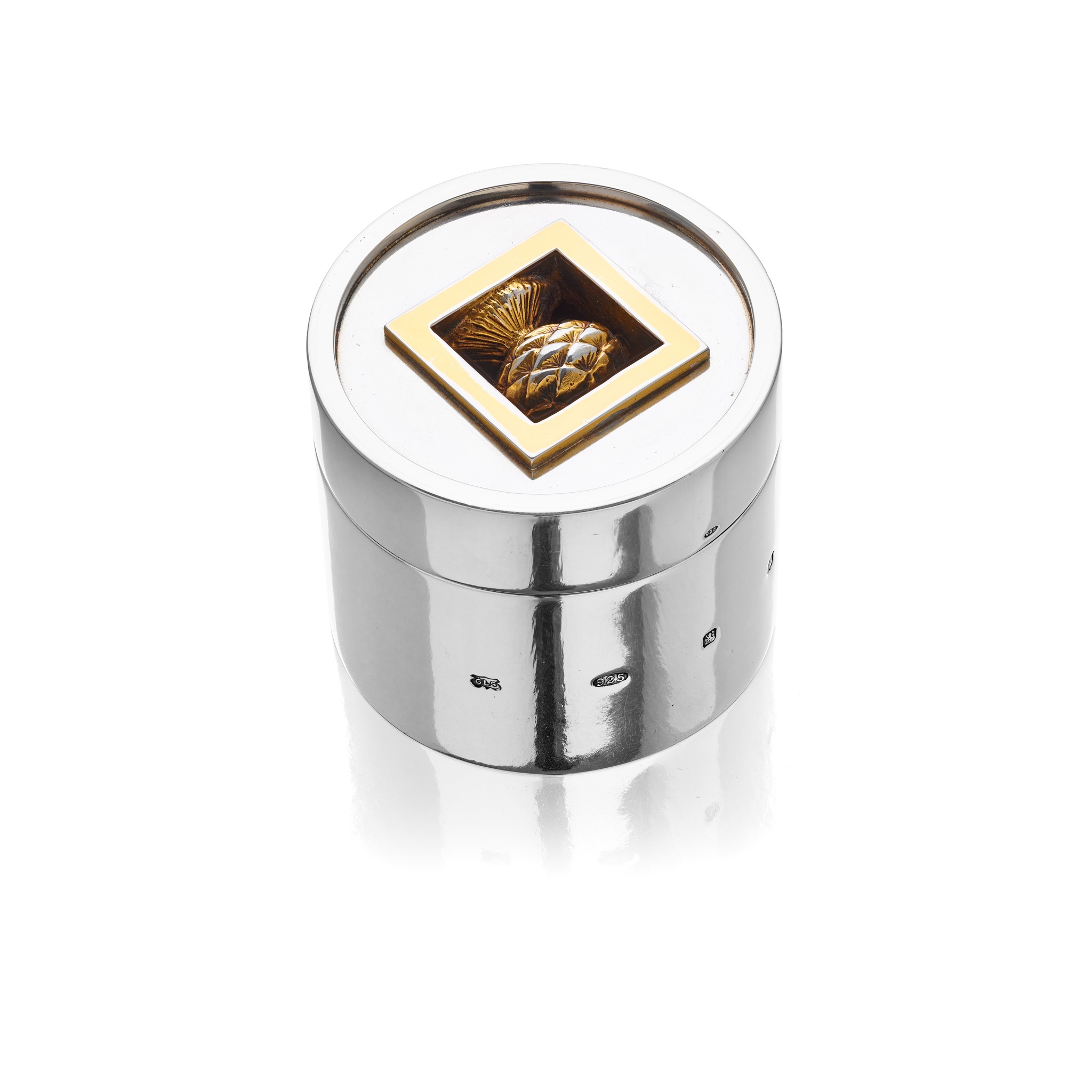 of cylindrical form, the pull of lid with a pierced silver-gilt thistle to the centre