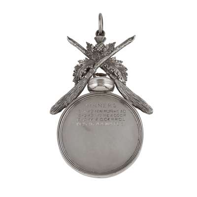 the medal of circular outline, engraved to obverse, 'TO THE/ FALKIRK CURLING CLUB/ FROM/ R.J. BUCK ESQ/ 1941/ FOR ANNUAL CLUB COMPETITION' winners engraved to the reverse, applied crossed curling brooms with thistle and curling stone with suspension loop to bale