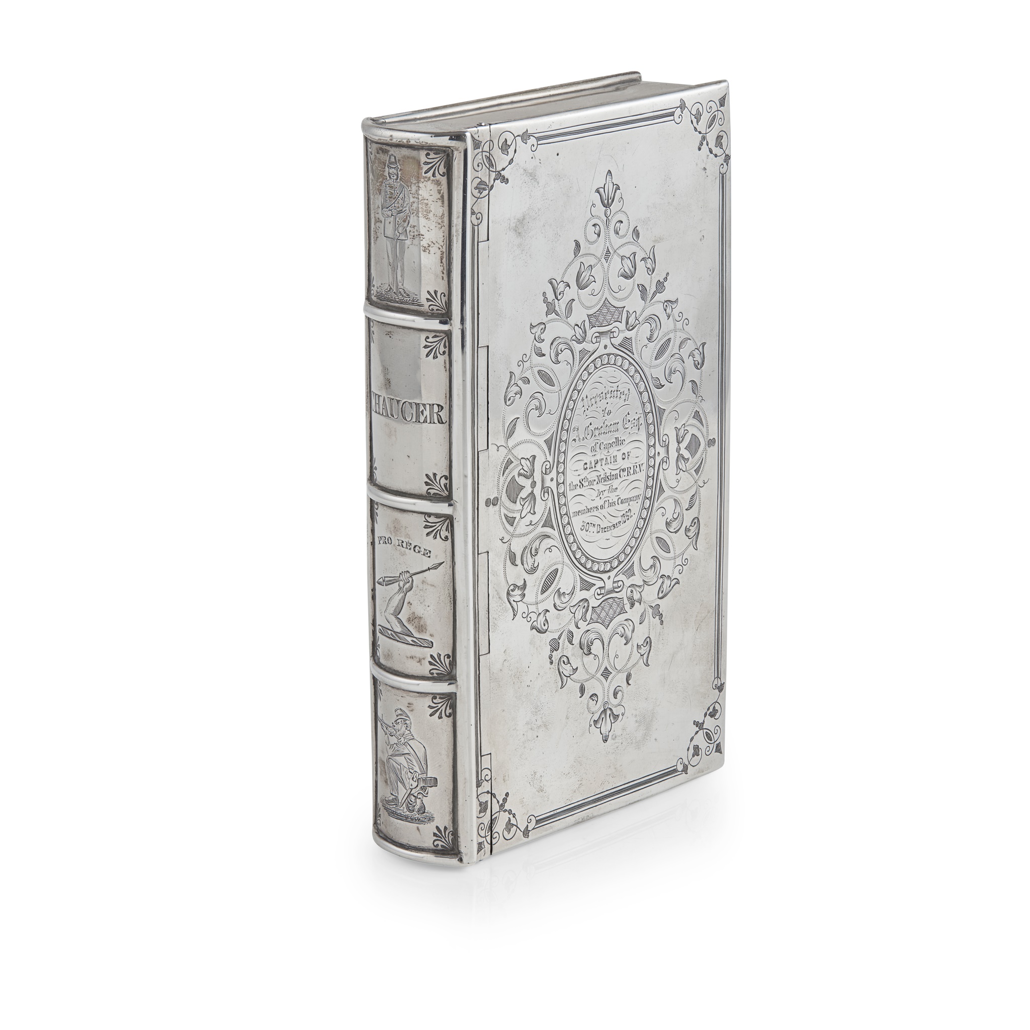 the large box formed as a book, the cover engraved with simulated tooling and a presentation inscription in an oval cartouche reading ‘Presented to A Graham Esq. of Capellie, Captain of the 8th or Neilston Co R.R.V by the members of his Company, 30th December 1862’, the spine engraved with soldiers at attention and crouched shooting with ‘title Chaucer and crest below, the base of the lower section engraved with a portrait of an officer presumed to be Captain Graham