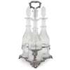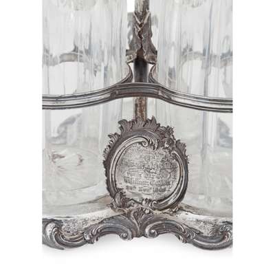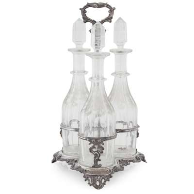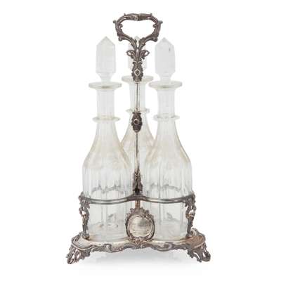 of trefoil form, the tall central handle and frame with shell and foliate decoration throughout, raised on three scroll foliate bracket feet, central foliate cartouche with presentation engraving 'to their nephew...1845' with a set of three facetted decanters and stoppers, each with vine and grape etched detail