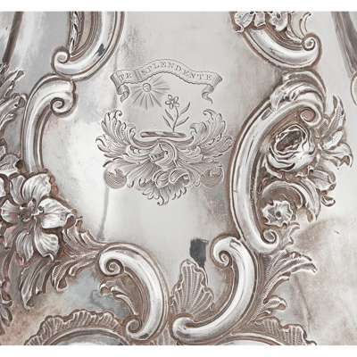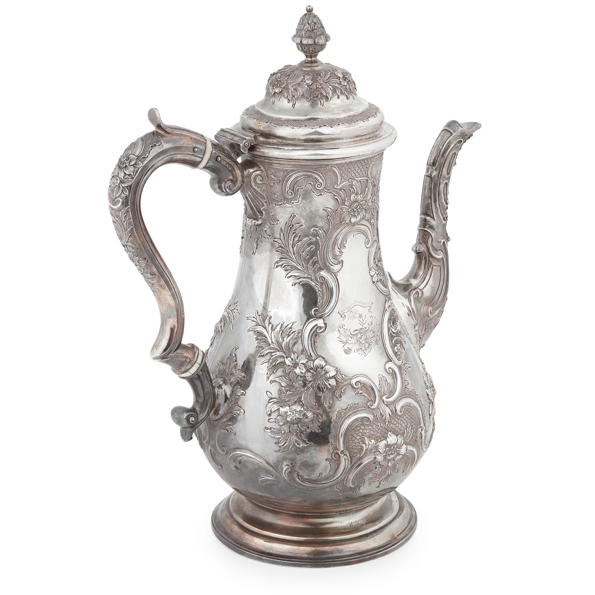 of baluster form, heavily chased floral and scroll decoration throughout, stylised cartouche to one side with crest and motto, vacant to other side, S-scroll handle with ivory inserts, the curved spout with shell detail, the domed lid with pineapple finial, all raised on a stepped circular foot