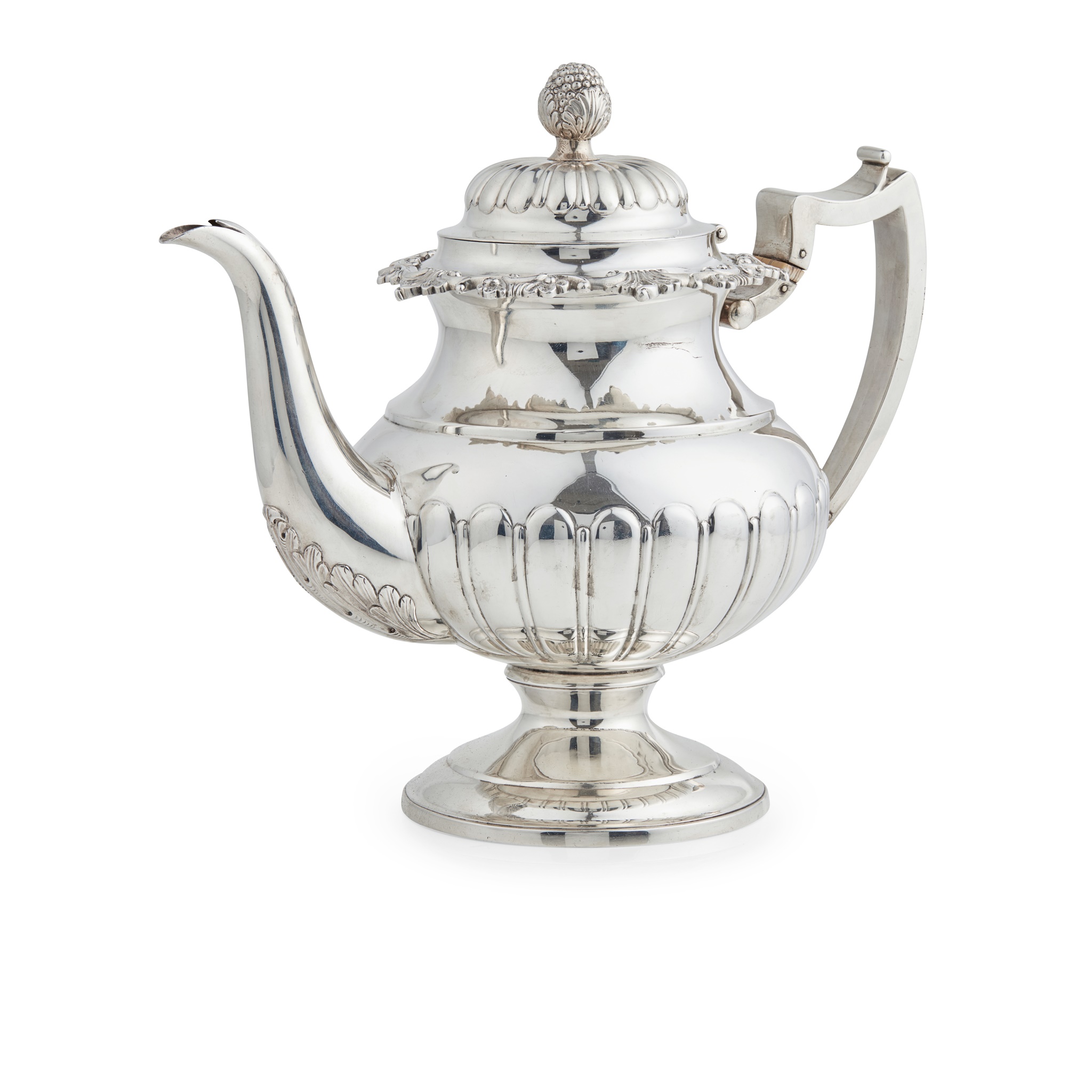 the baluster body with fluted lower section and waisted upper neck with S scroll spout and angular handled and domed hinged cover
