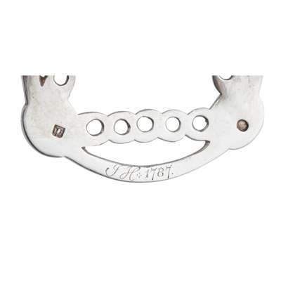 part Edinburgh marks (date letter lacking) of arched rounded rectangular form with rosette head and interlace borders within a reeded frame, with steel hinged buckle, the border engraved ‘JH 1787’