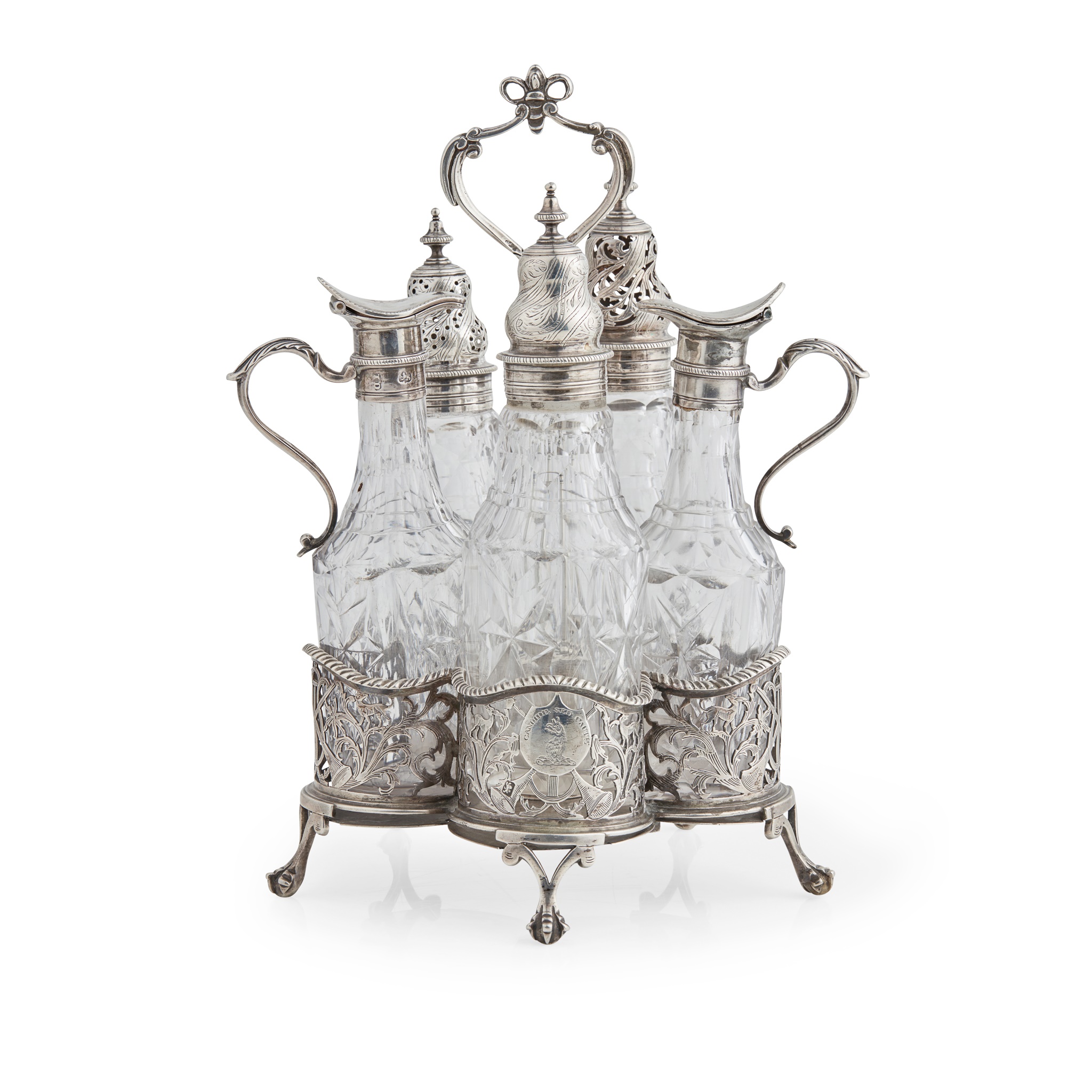 with London part marks as well, the cinquefoil base with finely pierced and engraved scrolling foliage with hunting horns, hounds and lyre, and gadrooned rim, with engraved crest and motto, with cast central stem with scroll handle, with five cut crystal bottles with hinged spouts and domed covers