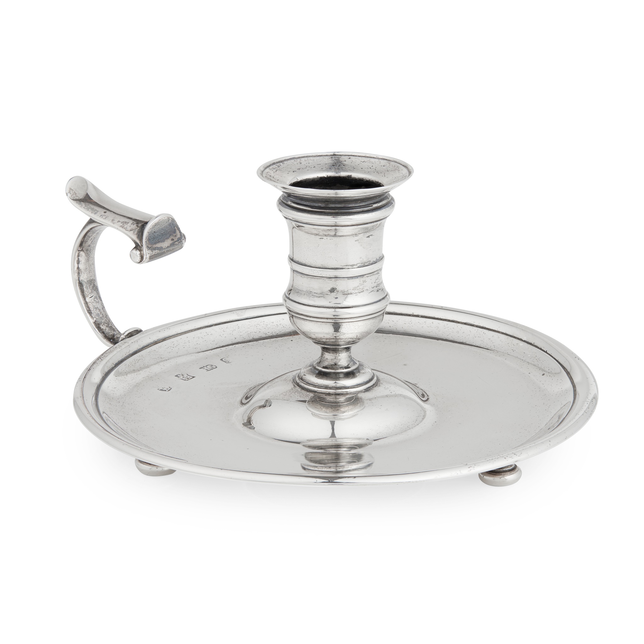 the central sconce set to a simple dished base with C scroll handle with plain thumbpiece, raised on three ball feet, the underside engraved with foliate initials