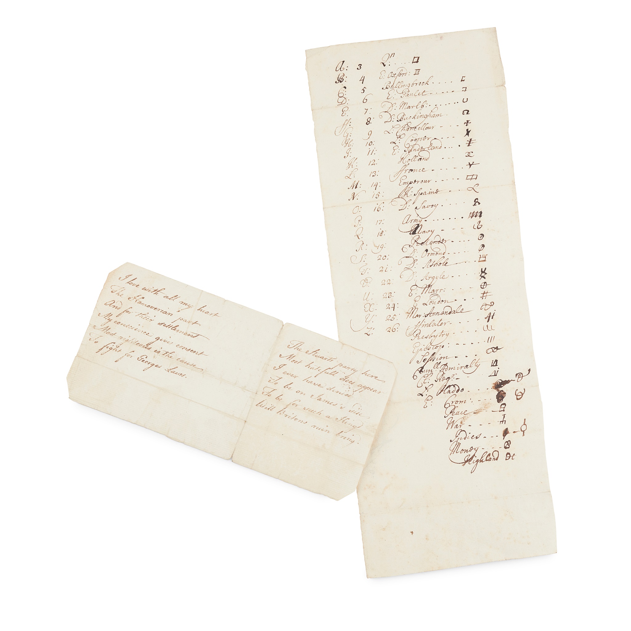 Manuscript in brown ink on single sheet of laid paper (30 x 10.7cm), in two columns, with alphabetic substitution code on left (A=3 etc.), and symbolic substitution code on right, the latter providing ciphers for the names of all the major figures in British politics during the reign of Queen Anne, including the Queen herself ('Qn'), the Duke of Marlborough, the Earl of of Oxford, the 'Pretender', the Earl of Mar, the Duke of Ormond, Lord Haddo, and similar, and for other key words including 'peace', 'war', 'Highland', 'Presbytry' (sic), etc., slightly spotted, old folds and ink-smudging; together with an anti-Jacobite poem ('I ever have denied / To be on James's side'; on a single sheet).