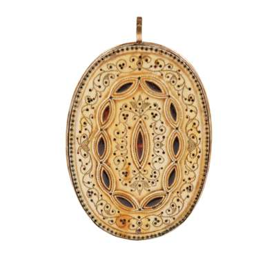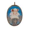the sitter wearing a black dress, cut square at the breast, the sleeves decorated with white bows and jewels, the bodice decorated with further jewels and a cross, starched white ruff collar, a pink lined cap over her auburn hair, pearls at her neck and waistband, within a gold border; watercolour on vellum stuck to card, within a gilt metal frame, the reverse with ivory panel inlaid with tortoiseshell and silver pique work