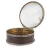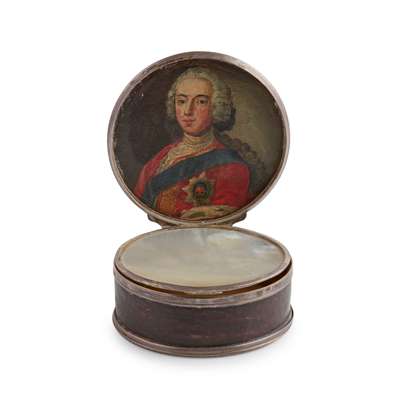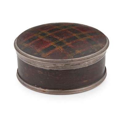 the circular snuff box with reeded rims, tartan decoration to hinged lid, body and base, the interior lined with mother of pearl discs to base and inner lid, the interior of lid with oil on copper half-length portrait of Prince Charles Edward Stuart
