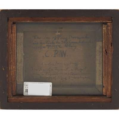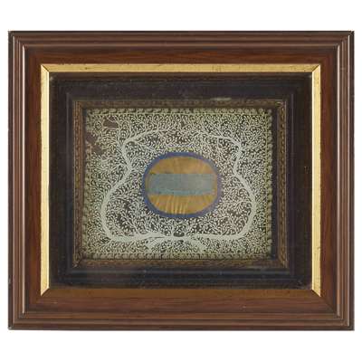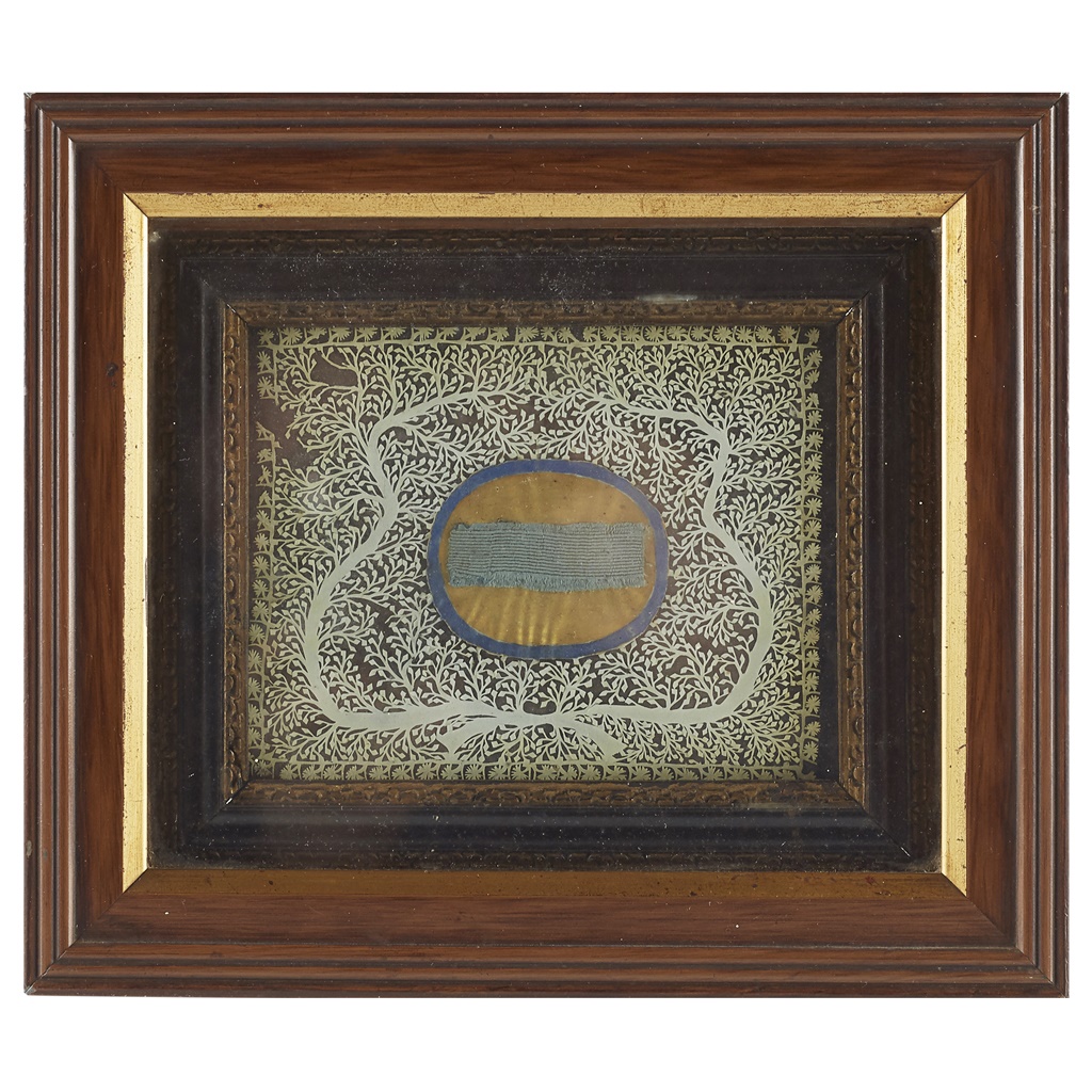 contained within a frame, surrounded by a decorative foliate cut paper design, marked in pen on the rear "The Pretender's Ribbon, presented to M. Beaumont Jan. 1800 by Richd. Henry Beaumont Esq., of Whitley". Also inscribed "The son of a Tory presents this relic to the grand delights of a truce whip C.P.W. Charles Prince of Wales, the son of a tyrant, a bigot and a papist"