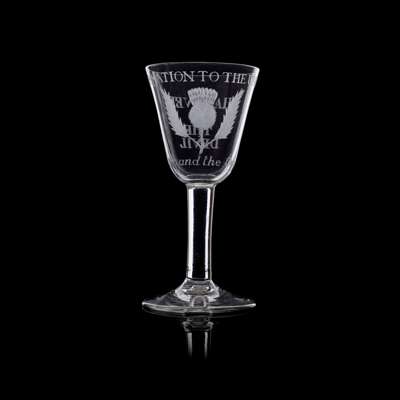 the deep round funnel bowl engraved to one side with a thistle flanked by two leaves; inscribed above the thistle 'DAMNATION TO THE UNION' and below 'Appin and the Cause'; inscribed to the opposing side 'HANOVER TO THE DEVIL'; raised on a plain stem and round conical foot