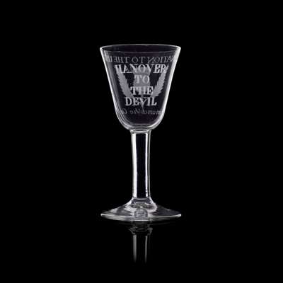 'HANOVER TO THE DEVIL' indicates the owners' hope that the Stuart legitimacy would one day be recognised, and the Hanoverian Kings would not only be removed from the throne but sent to the Devil. Other glasses with the House of Hanover and the Devil are recorded, notably within the collection of Traquair House. 'DAMNATION TO THE UNION' is overtly an anti-Union sentiment that many Scots still held by the mid-18th century.