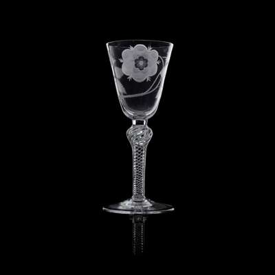 the deep conical bowl with large engraved displayed rose head flanked by open and closed buds, to the reverse a star, raised on an air twist stem with a large upper knop