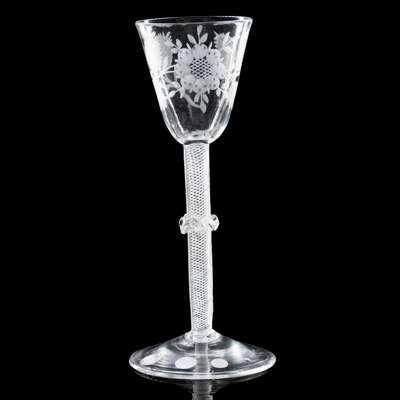 the bucket bowl engraved with a stylised rose head within foliage, on an air twist stem with vermiform collar, on a domed circular foot