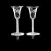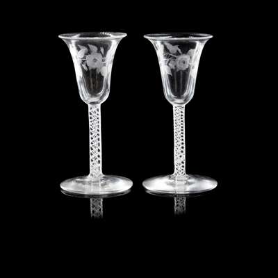the large flared bowls engraved with a trailing border of rose heads and foliage, raised on slender multi spiral opaque twist stem and spreading circular foot