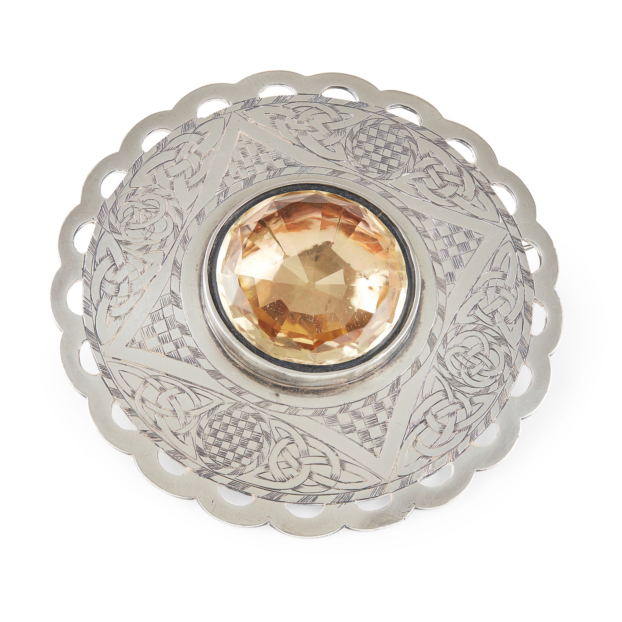 of circular outline with a pierced scallop border, collet set with a yellow foil back paste to the centre, in a border of engraved Celtic knotwork decoration