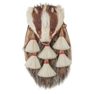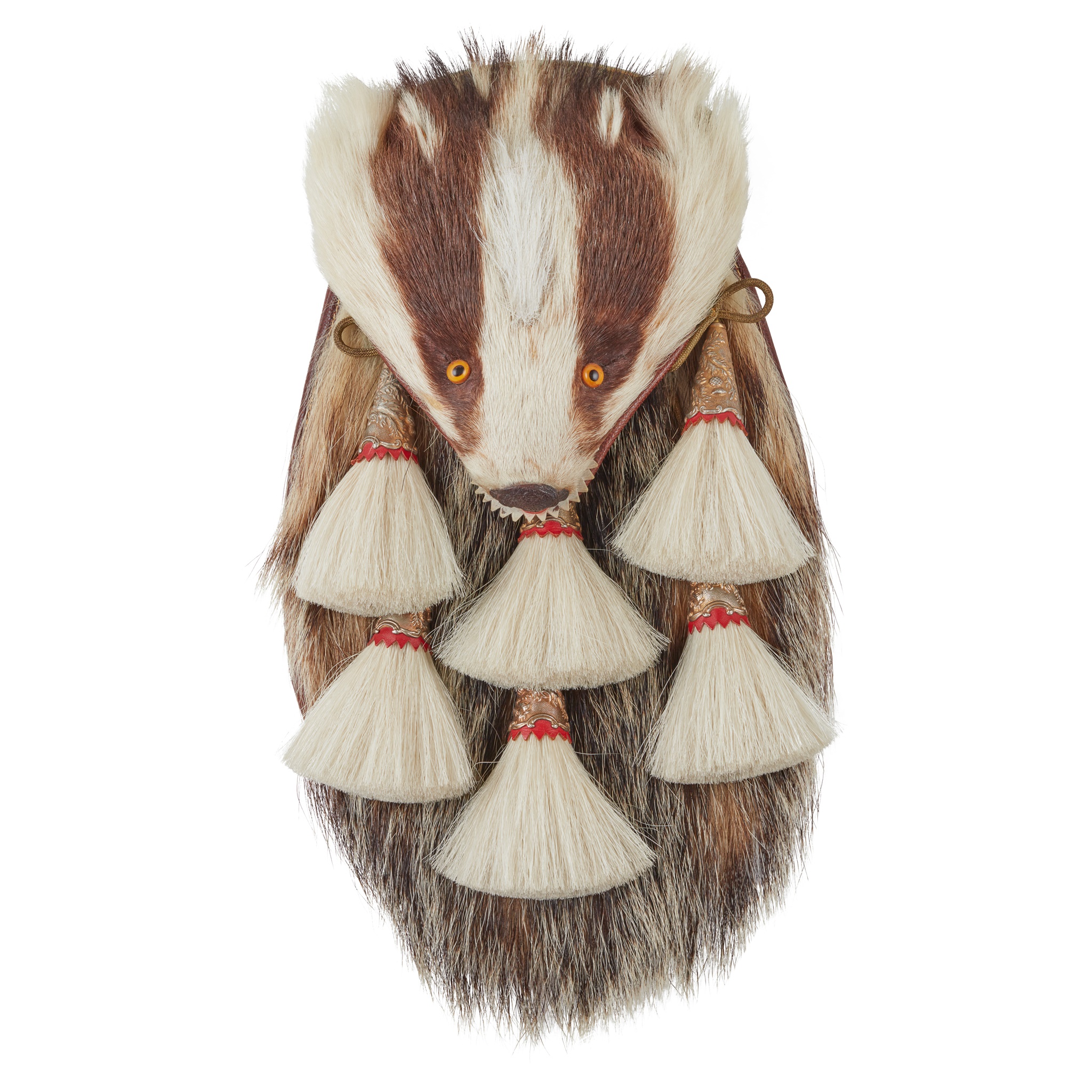 the full badger mask sporran with six tassels with gilt bells, the arched brass cantle to red leather backing