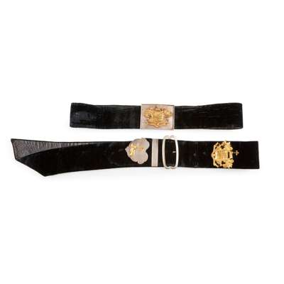 comprising waist belt and cross / word belt, the waist belt buckle of rectangular outline with rope twist border, the matted ground applied with gilt armorial with acanthus mantling, the wait belt of black velvet and leather-backed, the cross/sword belt of black velvet applied with full armorial to shoulder and with matted silver buckle and mounts, the lower mount with applied Macdonald crest